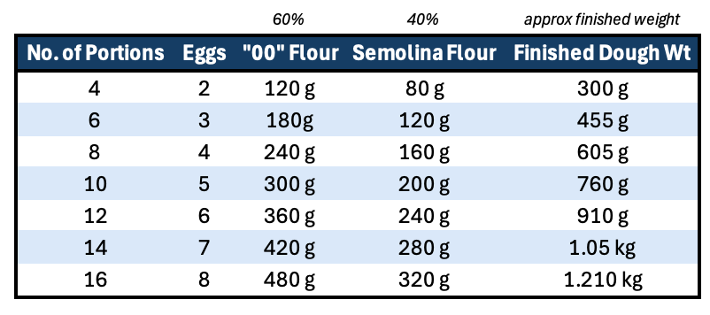 Place all ingredients in mixing bowl (I use a power mixer), add salt to taste and mix until dough forms. Turn dough out onto a floured surface and knead until very smooth. Place dough in a plastic bag (or other air restricted container - so it does not dry out) for minimum of 30 minutes. When soft, cut off portioned amount, press through pasta press up to number 6 using plenty of Semolina flour. Cut into desired shape. Cluster into nests (again, using plenty of Semolina flour). Cook in boiling salted water. Fresh pasta cooks fast (about 3 - 4 minutes depending on thickness of the pasta).